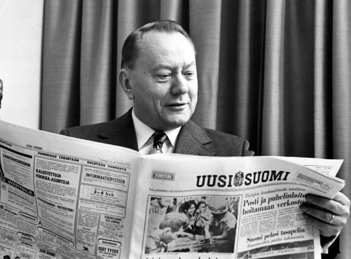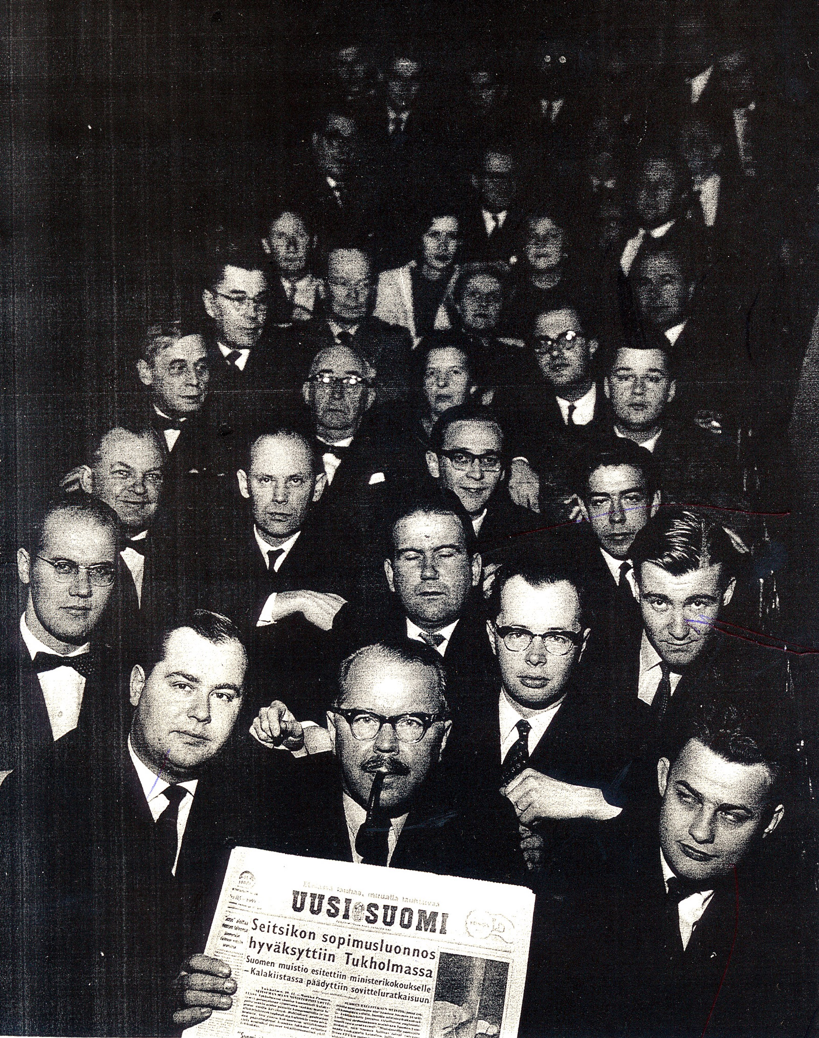 Uuden Suomen toimitus 1959 kokoontuneena Lönnrotinkadun toimitilan portaikkoon. Myöhemmin kuvaan ympättiin saksilla ja liimalla puuttuvia henkilöitä. Edessä päätoimittaja ja SSL:n puheenjohtaja Eero Petäjäniemi, etualalla mm. Matti Paavonsalo, Jouko Ruotsalainen, Pentti Pirhonen, Lauri Karén, Martti Savojärvi, Heikki Jalanti ja Pentti Vuorio.