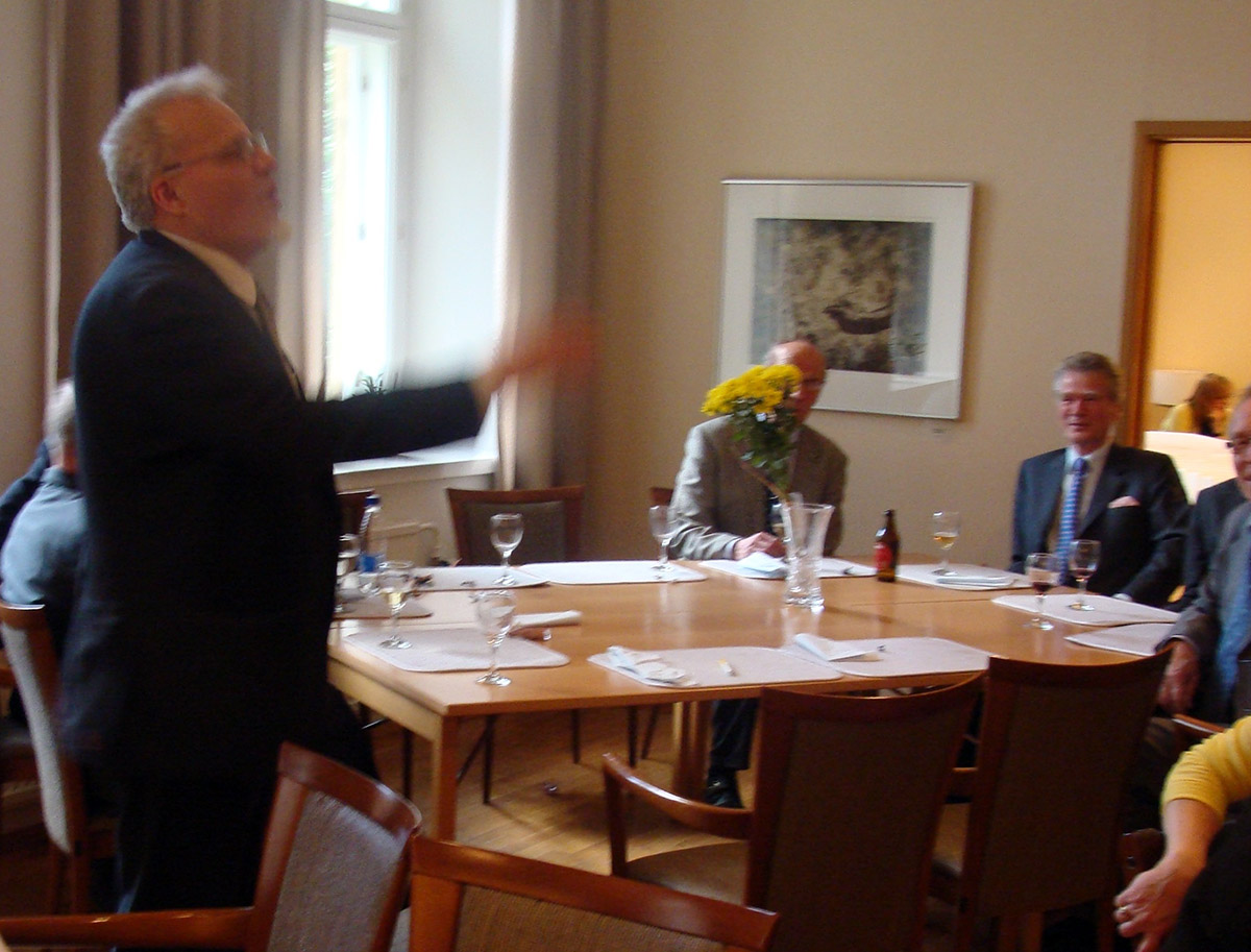 Vierailua Suomen Pankkiin 2011 jatkettiin pankin virkistystiloissa. Jyrki Vesikansa johtaa laulua, taustalla mm. Matti Laitinen ja Veikko Löyttyniemi.