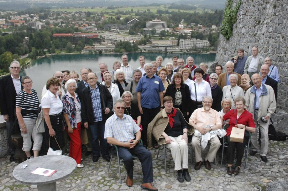 Sloveniassa 2009 kokoonnuttiin kauniin järven äärellä olevan linnan pihalle. Eturivissä Ari Valjakka, Tuula Virtanen sekä Jyrki ja Päivi Vesikansa.