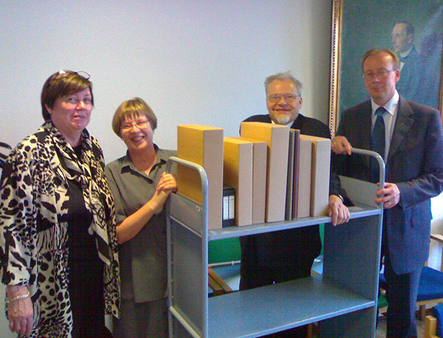 Liiton arkisto on luovutettu Kansallisarkistoon 2006, vas. varapuheenjohtaja Tuula Virtanen, Marja Pohjola (KA), Jyrki Vesikansa ja pääjohtaja Jussi Nuorteva, ”Ollin” pojanpoika.