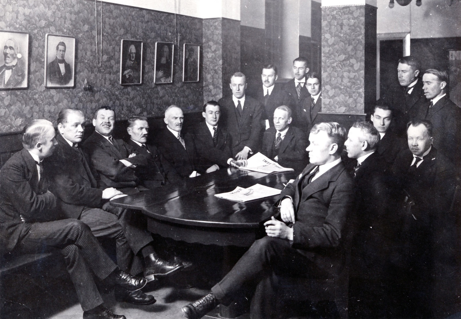 Uuden Suomen kovin miehinen toimitus 1920-luvun alussa. Viides vasemmalta päätoimittaja ja SSL:n puheenjohtaja Ernst Nevanlinna. Seinällä kansallisten suurmiesten muotokuvia.