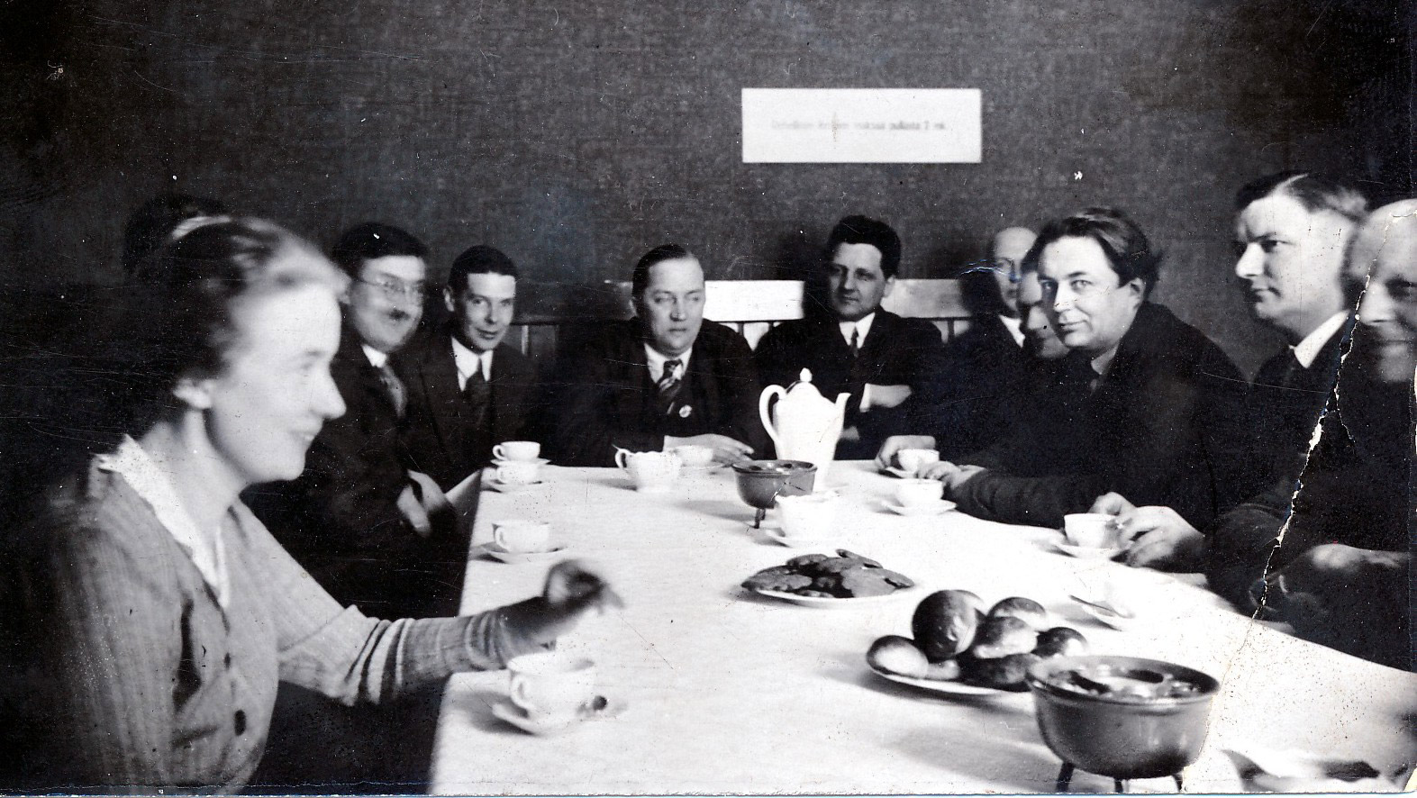 Naiset tulevat – eli reipas Anni Voipio Uuden Suomen toimituksen kahvipöydässä 1920-luvun lopulla. (Olisiko ”varpunen” jossakin kätkettynä?) Mukana mm. US:n tuleva Lontoon-kirjeenvaihtaja Juho Timonen, keskellä Uuno Hirvonen sekä radiotoimittaja Erkki Kairenius.