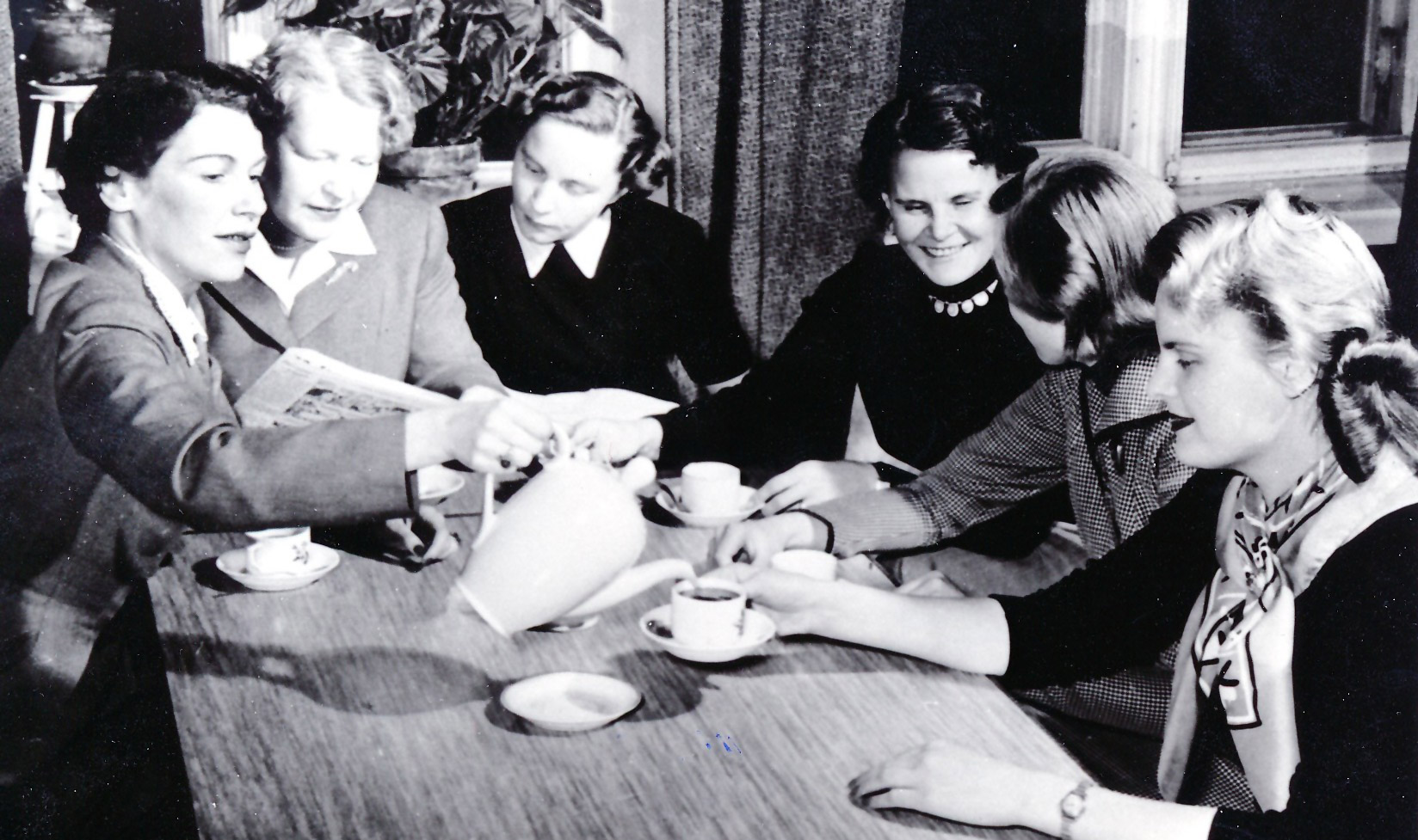 Naisia oli 1950-luvun alussa US:n toimittajakunnassa jo runsaasti. Vas. Soile Järvelä-Kairenius, Kerttu Niilonen, Irma Ahlgren, SSL:n pitkäaikainen sihteeri Salama Simonen-Hirvonen, tunnistamaton ja Marjatta Herva. Kahvi on säännösteltyä vuoteen 1953 saakka, mutta sitä saa jo.