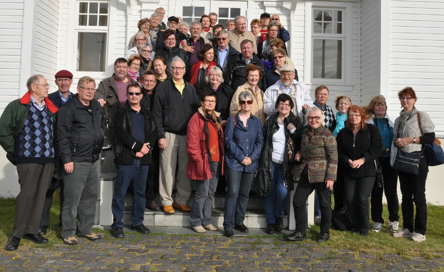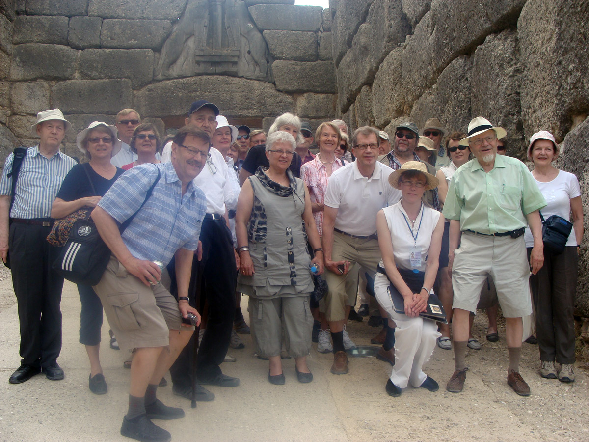 Liiton matkalaisia Kreikassa 2010 Mykenen Leijonaportin edessä. Täältä kai lähdettiin Troijan sotaan. Vas. monivuotinen johtokunnan jäsen Eero Helariutta, edessä Satakunnan Kansan päätoimittaja Erkki Teikari ja muita porilaisia, oikealla edessä mm. Jukka Reinikainen, Maire Mäkinen, Tuomo Saarikko, Kirsti Sintonen sekä Jyrki ja Päivi Vesikansa.