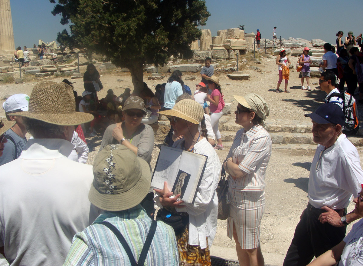 Liiton Kreikan-matkalla 2010 Maarit Niemisen opastusta Akropoliilla seuraavat (oik.) muun muassa tuleva puheenjohtaja Kirsti Sintonen sekä sitkeä veteraani Pekka Rantala.