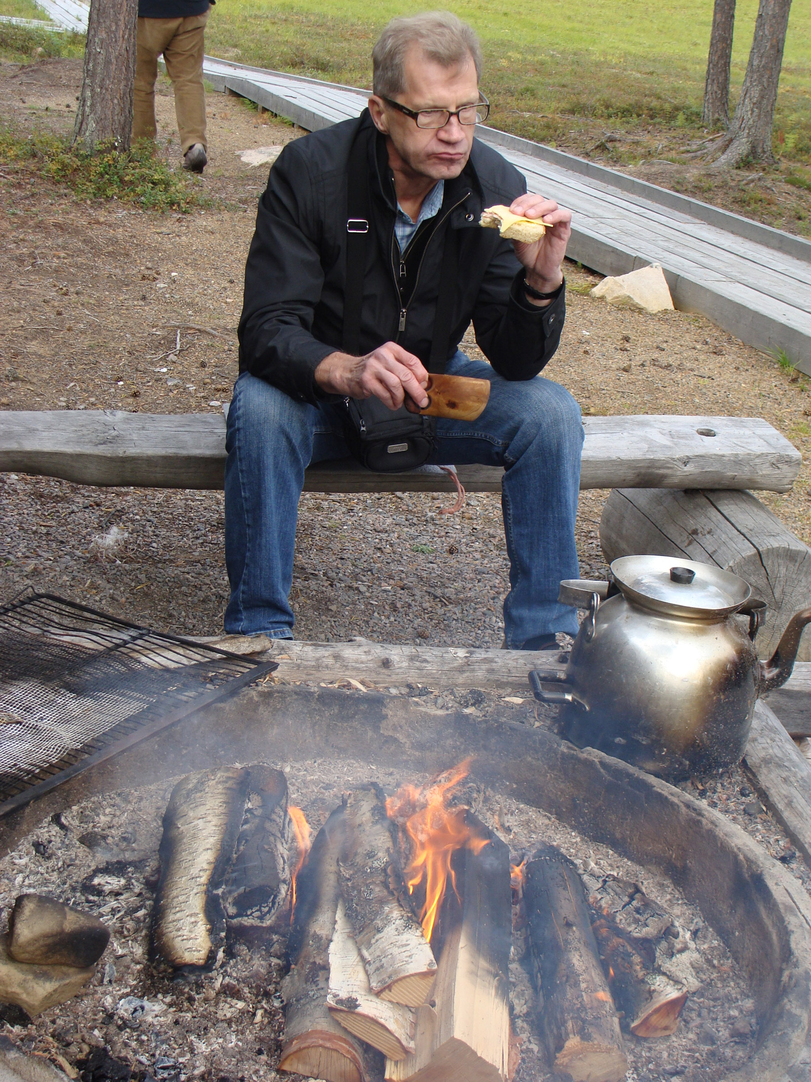 Liiton pitkäaikainen sihteeri Jukka Reinikainen kahvitauolla Pohjois-Ruotsin retkellä.