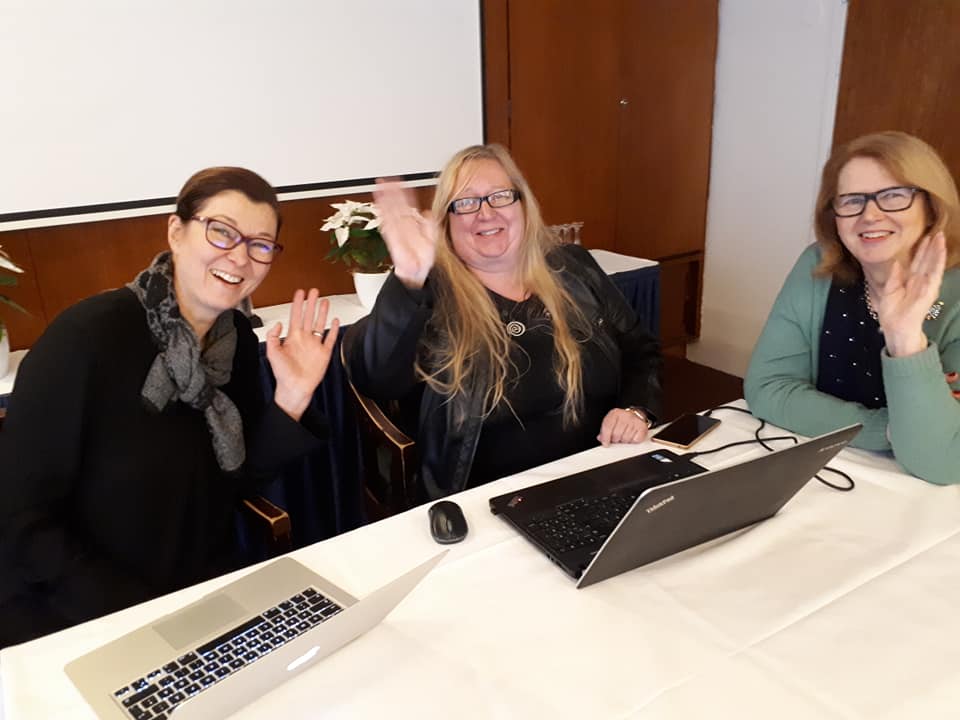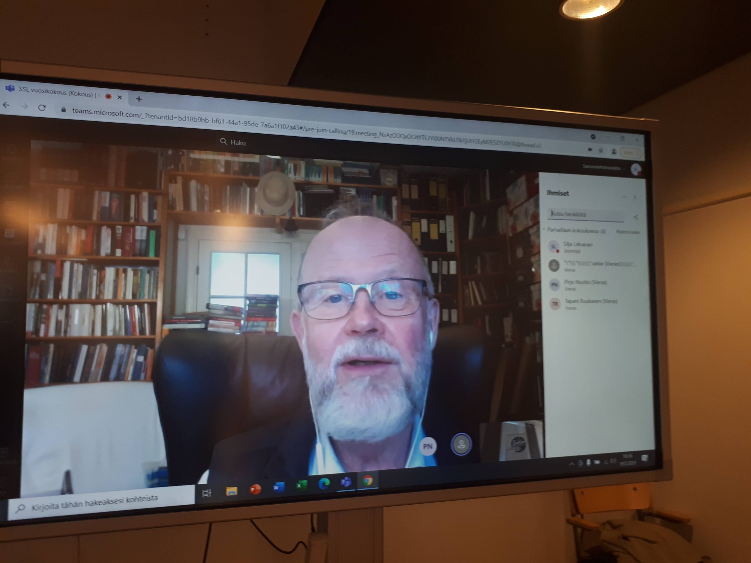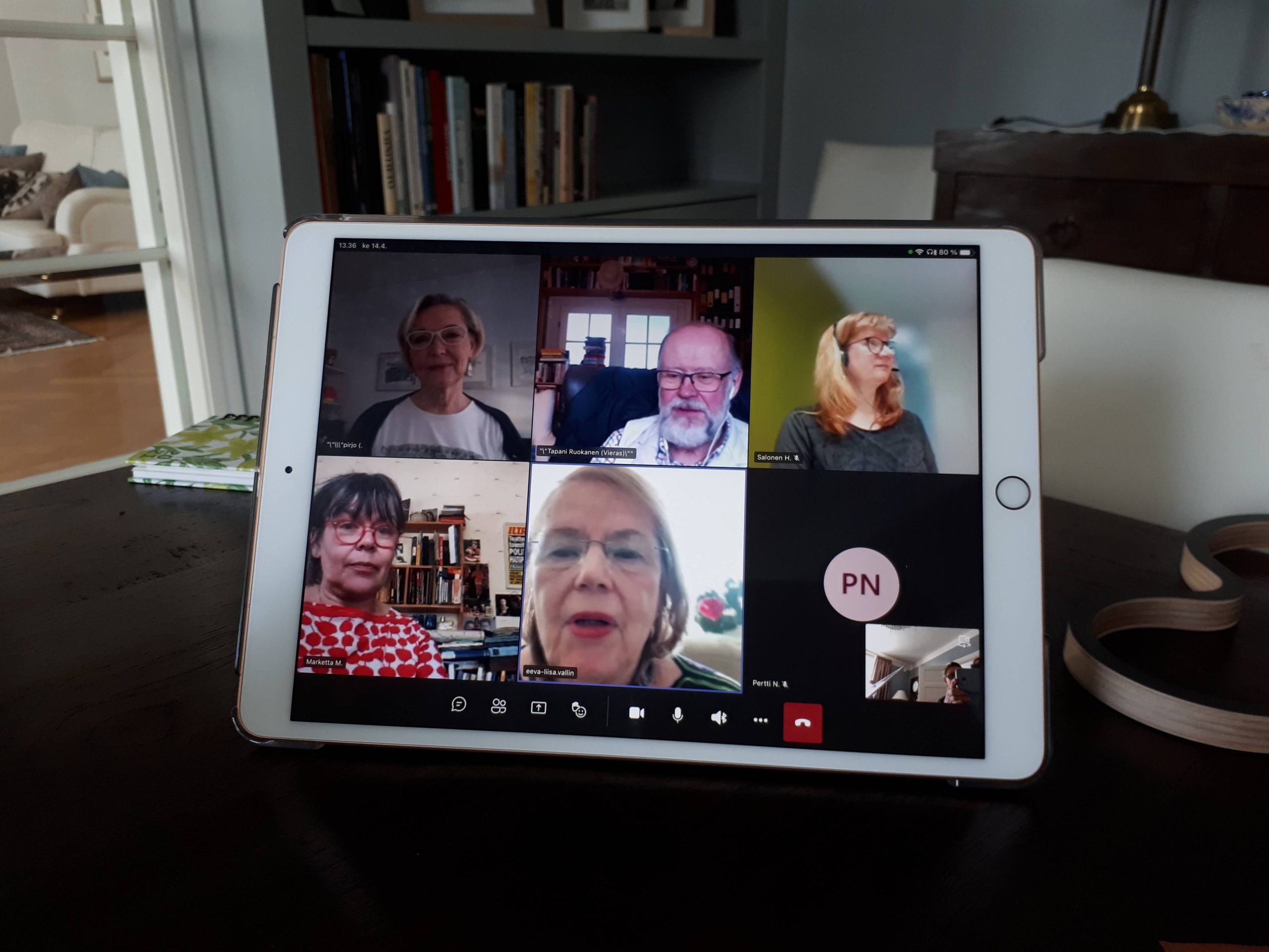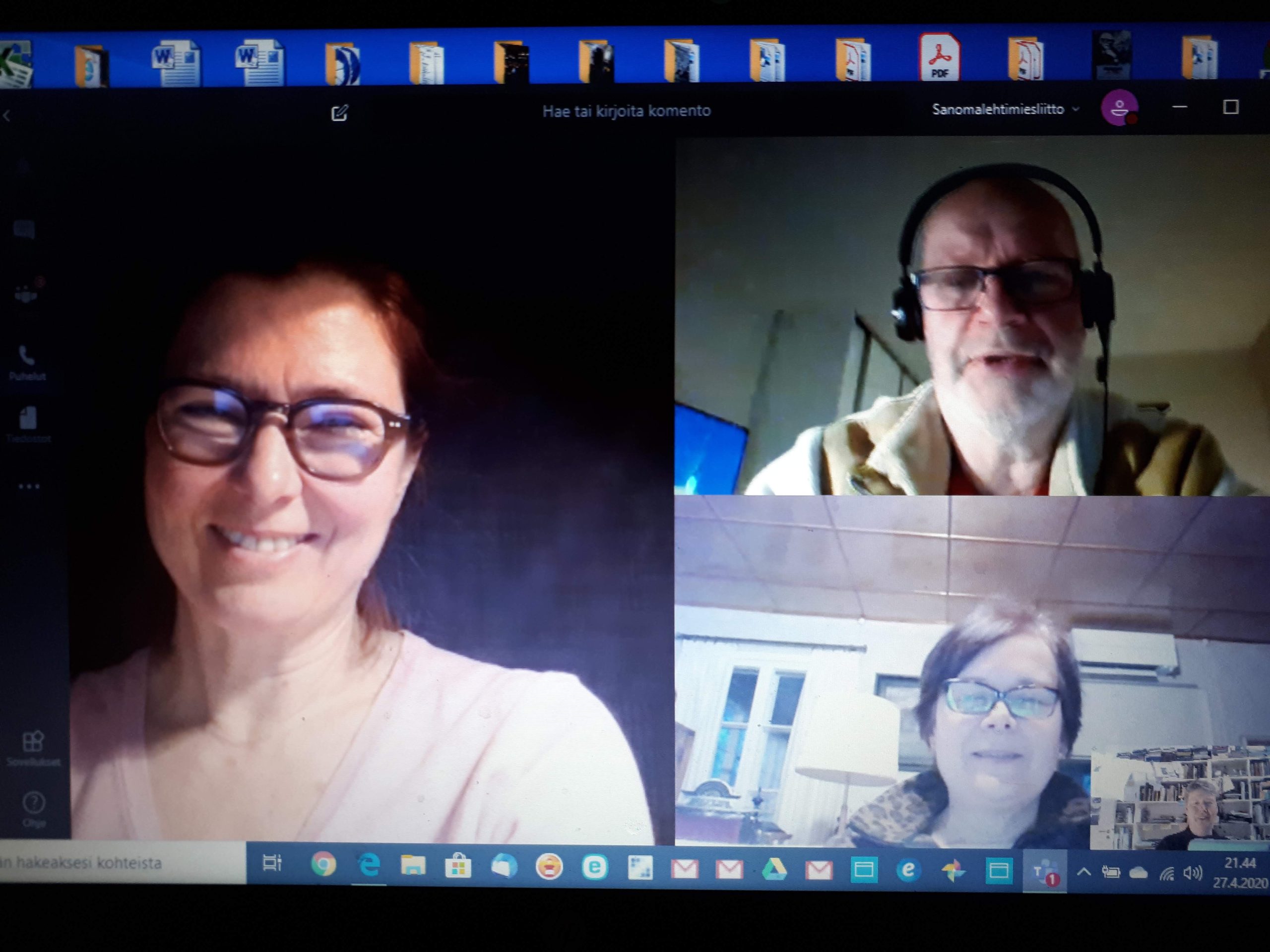 Johtokunta otti käyttöön teams-tapaamiset. Vuosikokousta valmisteltiin teams-palaverissa 27.4.2020. Ruudulla Silja Latvanen, Risto Kunnas ja Kirsti Sintonen, taustalla Maarit Tyrkkö.