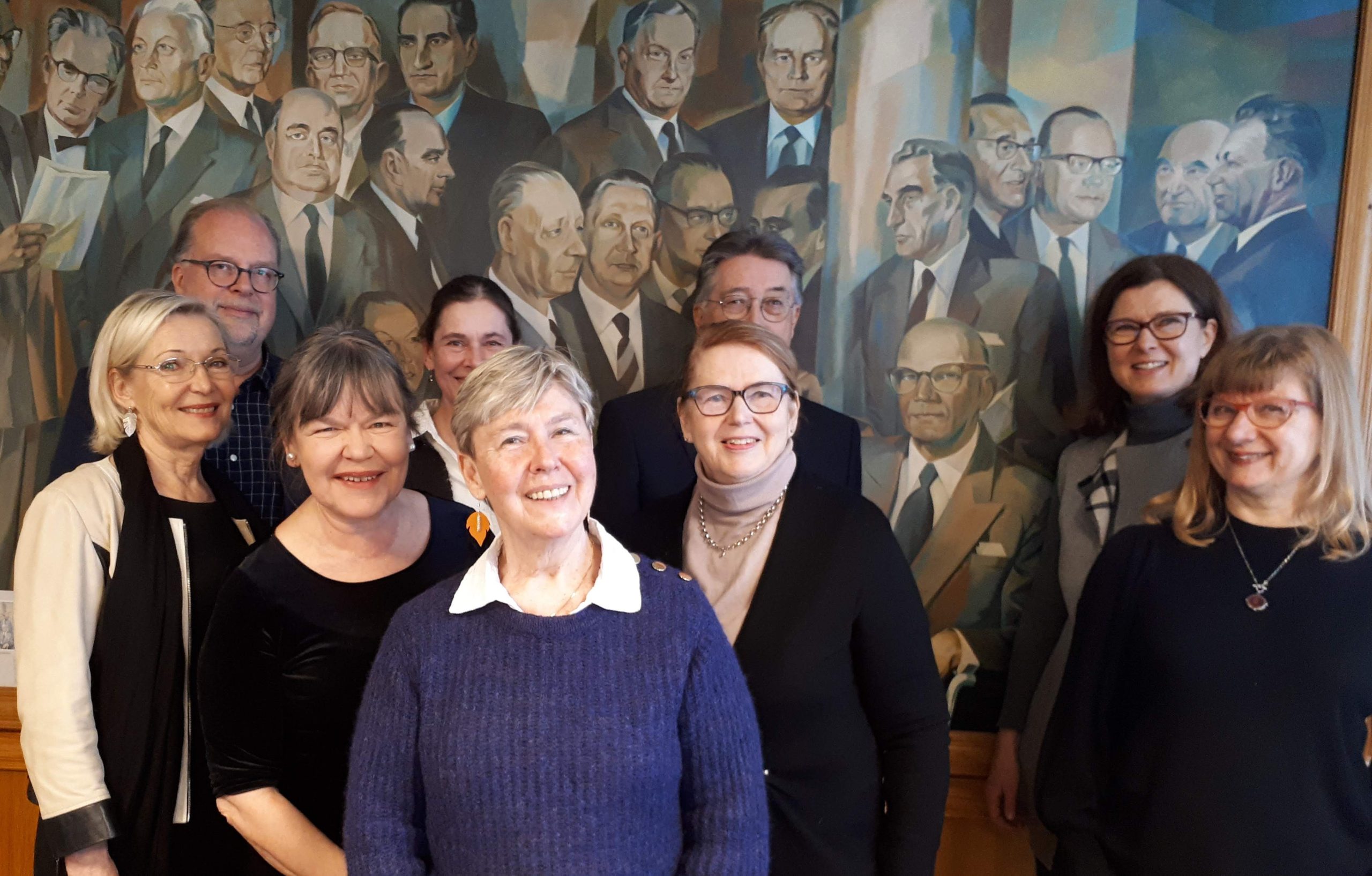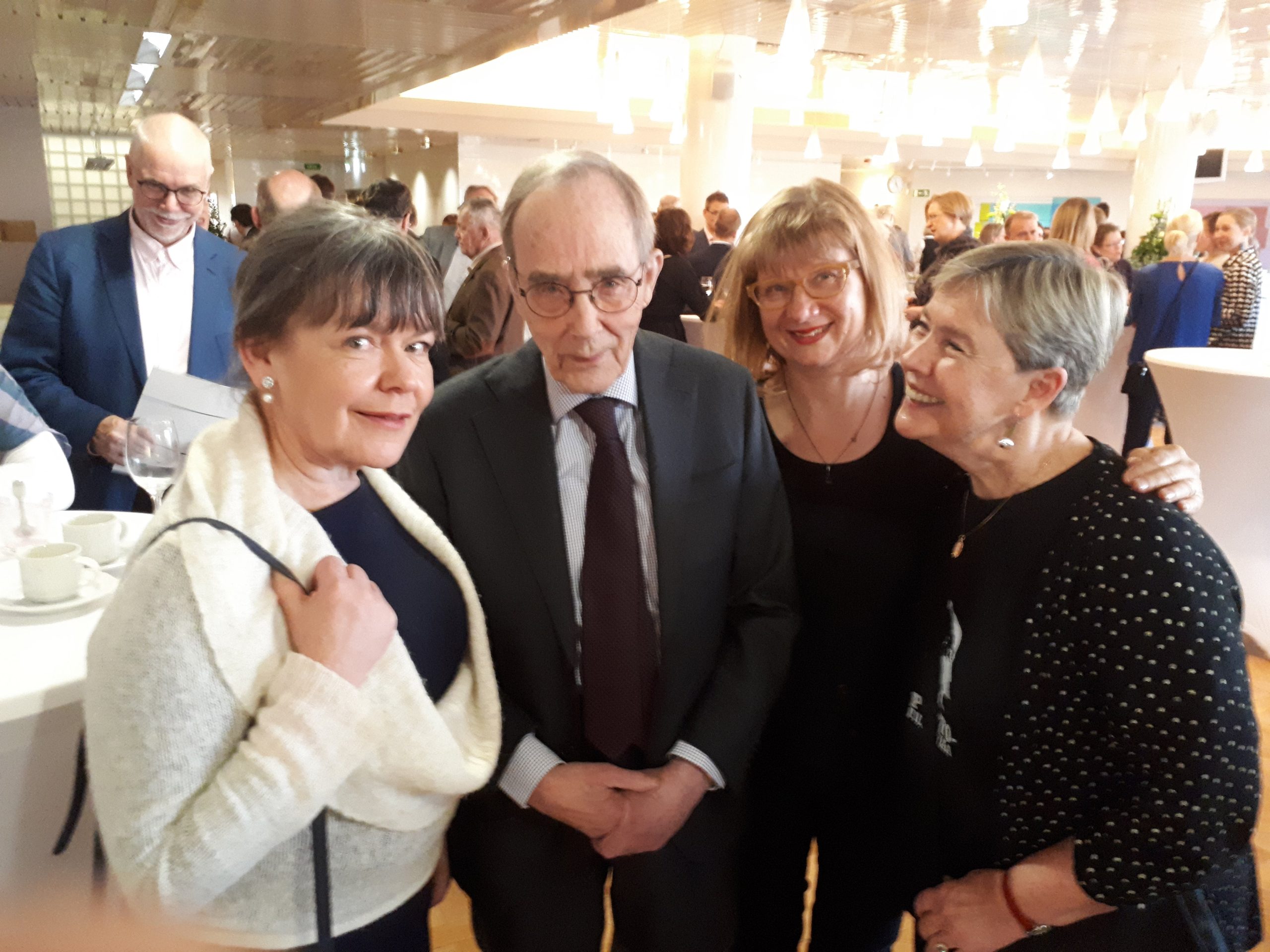 Jäsenten joukossa oli entinen TS-päätoimittaja Ari Valjakka. Taustalla hymyilevät Elina Simonen (vas.) ja Pirkko Paaermaa.