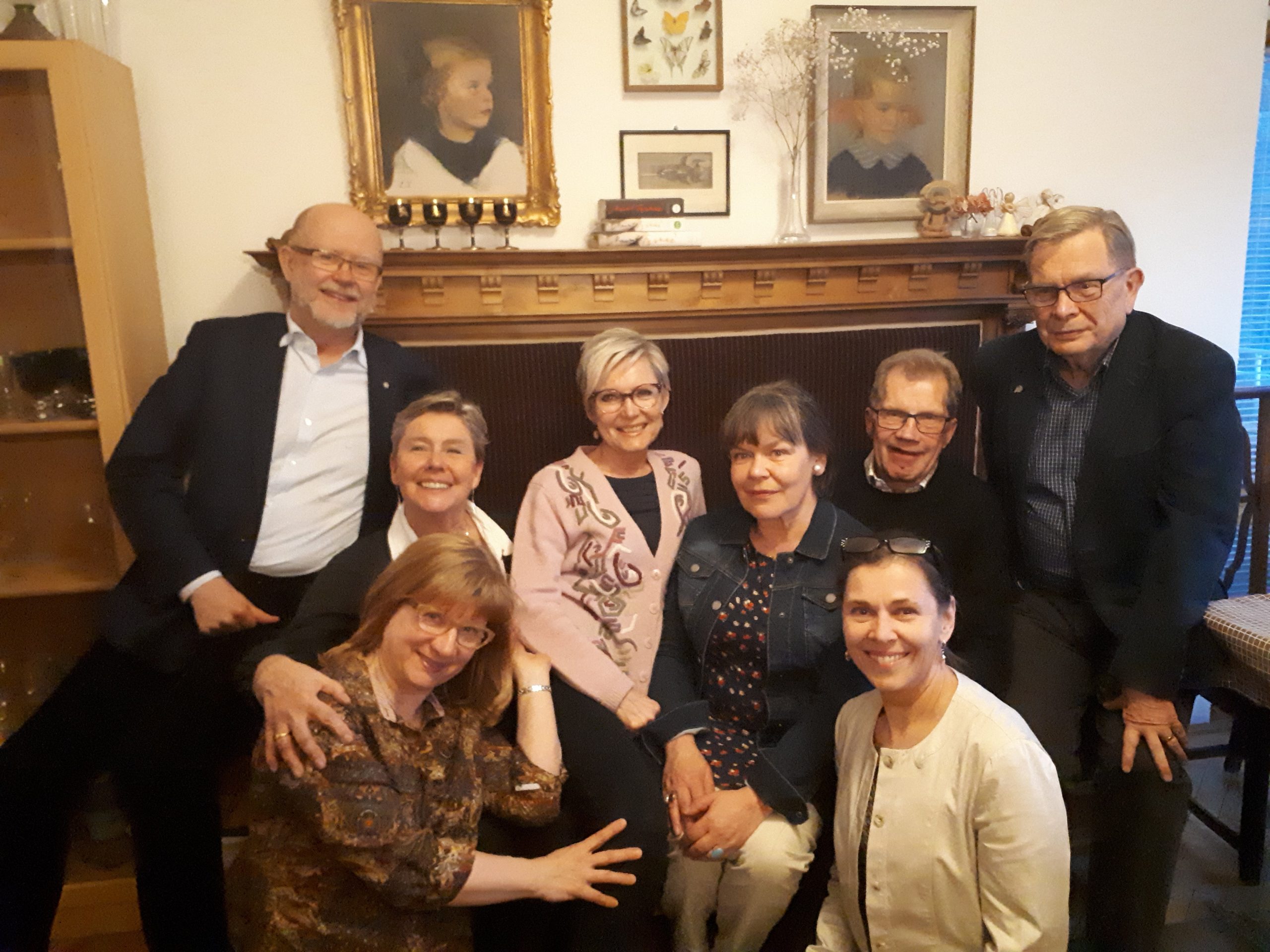Tapana oli ollut, että ennen vuosikokousta johtokunta kokoontui puheenjohtajan kotiin valmistelemaan asioita. Niin nytkin (12.4.2018). Kokoustettiin, syötiin ja päätettiin kunniajäsenistä ja Olli-palkinnoista. Sohvalla Tapani Ruokanen (vas.), pj. Maarit Tyrkkö, Pirjo Nuotio, vara pj. Marketta Mattila, sihteeri Jukka Reinikainen ja Jaakko Leppänen. Edessä Heljä Salonen ja Nina Stenros.