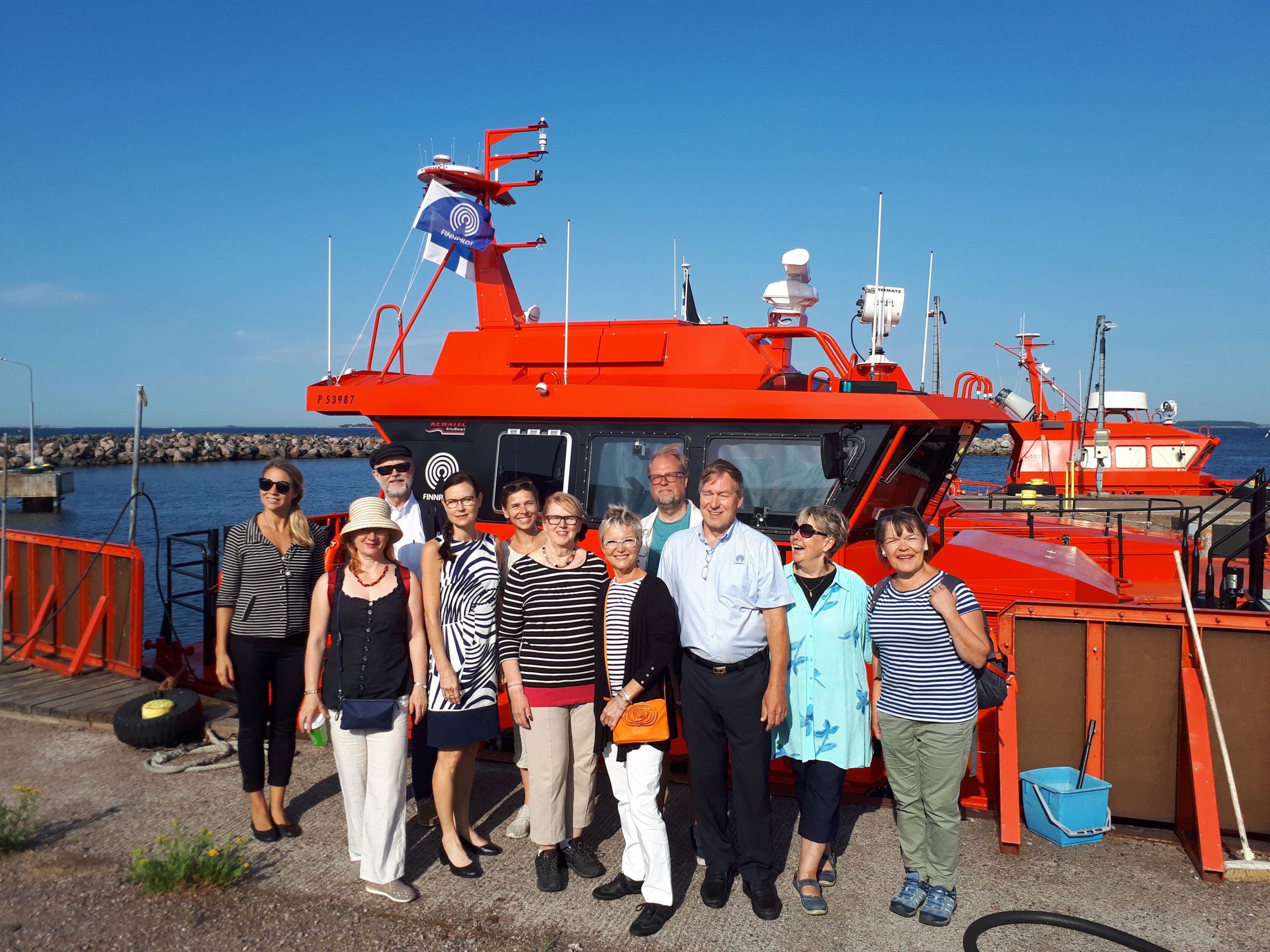 Puheenjohtajan tehtäviin kuului pitää yllä hyvää henkeä johtokunnassa. Yhteinen kesäretki suuntautui Harmajan majakalle (10.8.2018). Kuvassa edessä isäntämme alueluotsivanhin Jukka Ketonen, ryhmän reunassa vasemmalla viestintäpäällikkö Laura Kaustinen ja luotsausjohtaja, merikapteeni Sanna Sonninen. Palattuamme rantaan tapasimme esittäytymään tulleen, uudeksi sihteeriksi löytämäni Silja Latvasen. Haastattelun jälkeen johtokunta teki päätöksen valita hänet.