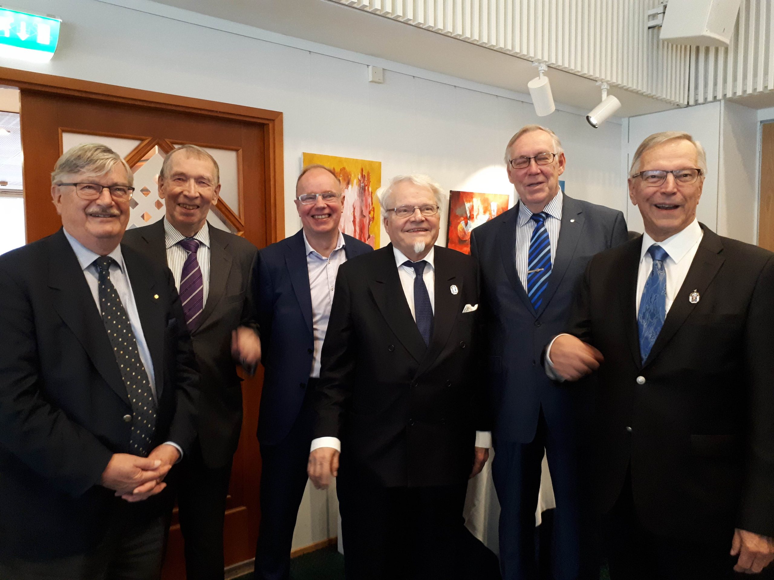Ja taas juhlittiin Suomalaisella Klubilla (30.9.2019), nyt Uuden Päivän Rahaston 100 vuotta. Yhteisvalokuvaan kokoontuivat paikalla olleet päätoimittajat. Jarmo Virmavirta (vas.), Jyrki Haikonen, Markku Huusko, Jyrki Vesikansa, Johannes Koroma ja Ari Valjakka.