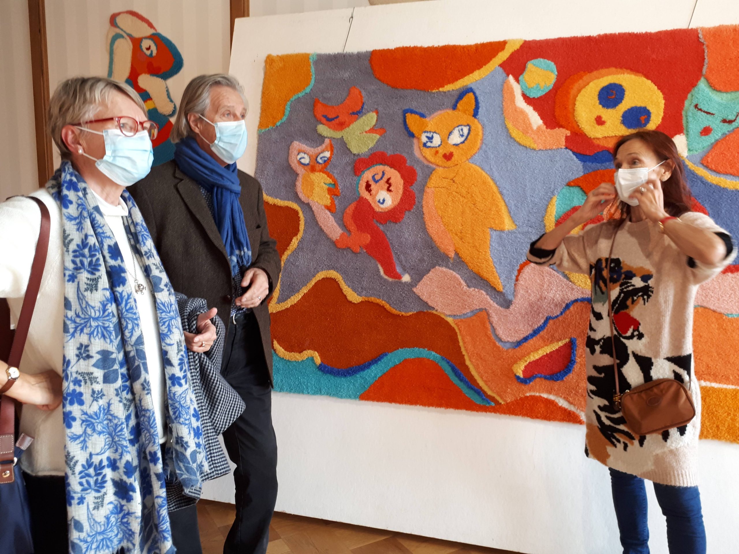 Kevätretki Riitta Nelimarkan Bongan linnaan Loviisaan muutettiin koronan takia syysretkeksi (10.10.2020). Halusimme mennä turvallisuus edellä. Avarat tilat, kirkkaat värit ja iloiset työt virkistivät. Taiteilijan kanssa keskustelemassa Anu ja Yrjö Klippi.
