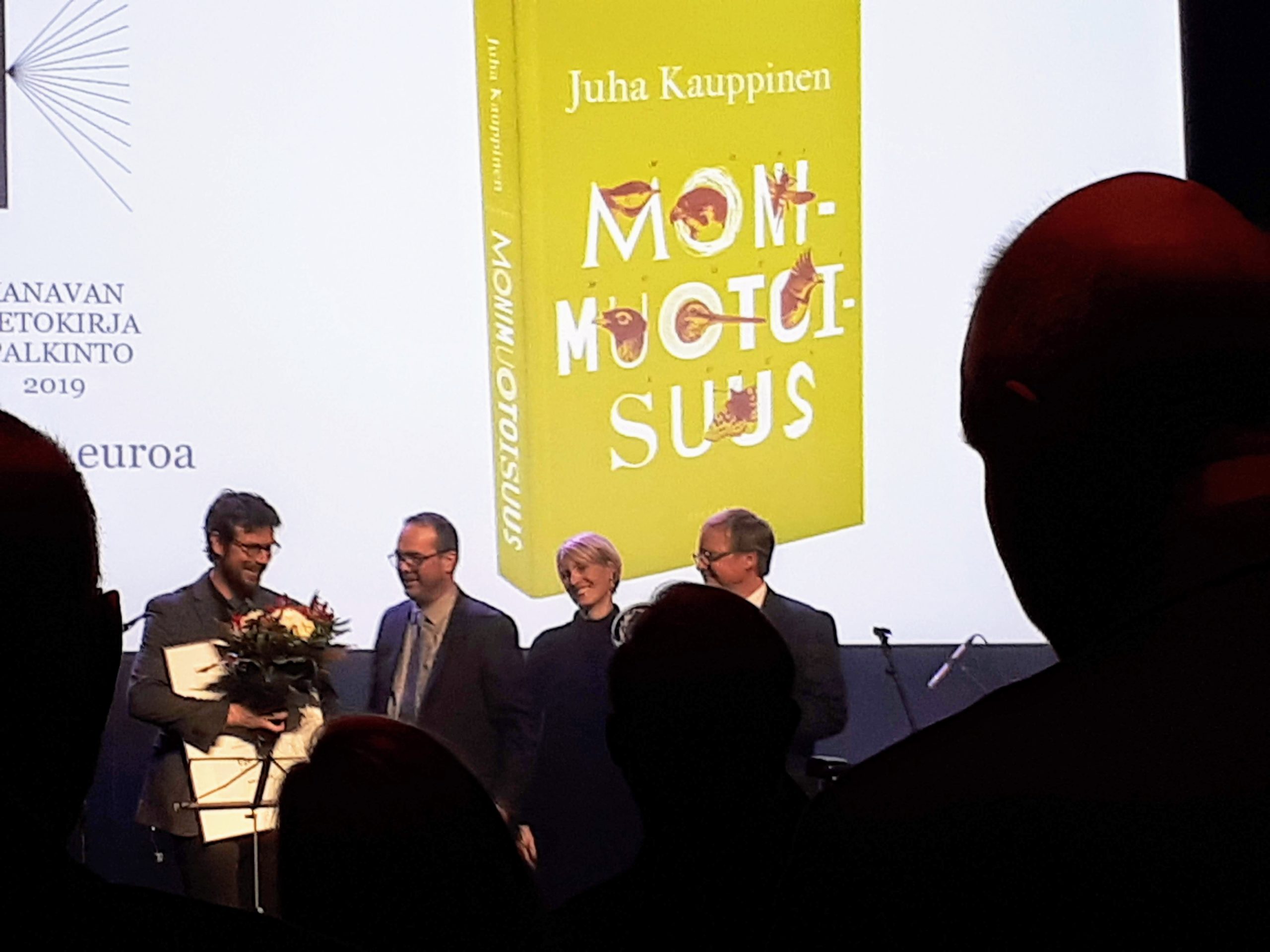 Juha Kauppisen teos sai Kanavan tietokirja palkinnon, sitä jakamassa Ville Pernaa, Riikka Suominen ja Tuomo Lappalainen.