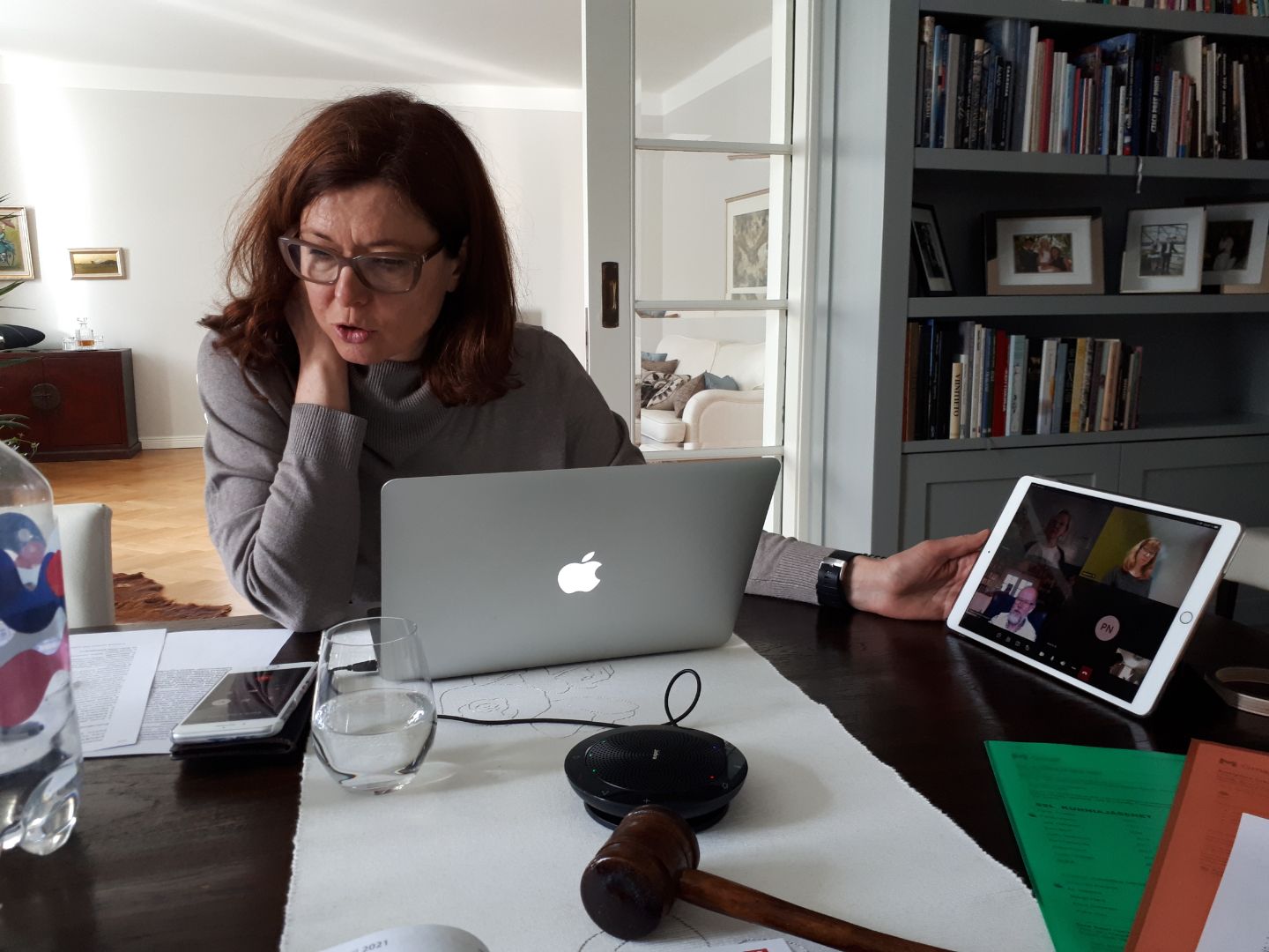 Vuorossa johtokunnan kokous (14.4.2021). Allakassani lukee: Suomalainen Klubi. Korona kuitenkin jatkui – ja kokoukset etänä. Olin Siljan kotona – muut Teamissa.