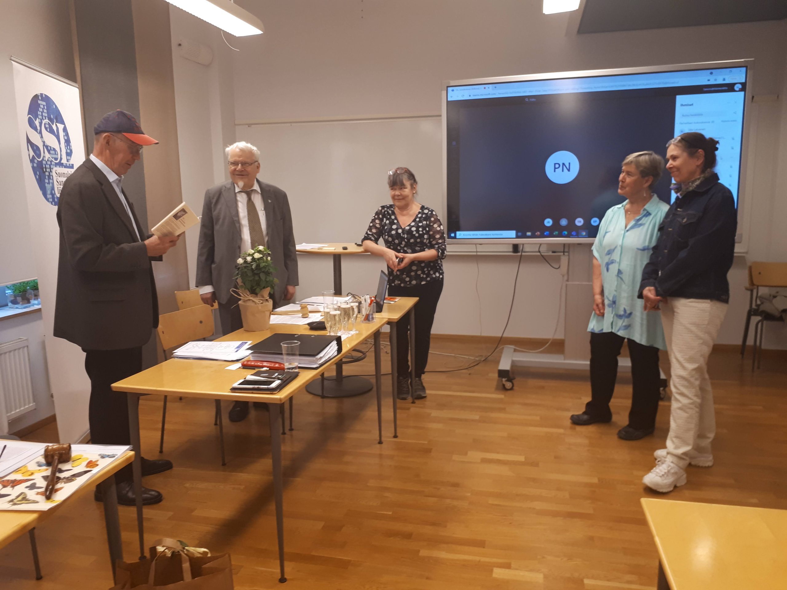 Vuosikokous etänä Allergiatalossa (19.5.2021), puheenjohtajana Jyrki Vesikansa. Kuvassa Olli-palkinnon saanut Matti Laitinen siteeraa kirjaa. Kuuntelemassa varapuheenjohtaja Marketta Mattila, puheenjohtaja Maarit Tyrkkö ja johtokunnan jäsen Nina Stenros. Iso ruutu edustaa jäsenistöä, etäosallistumista.