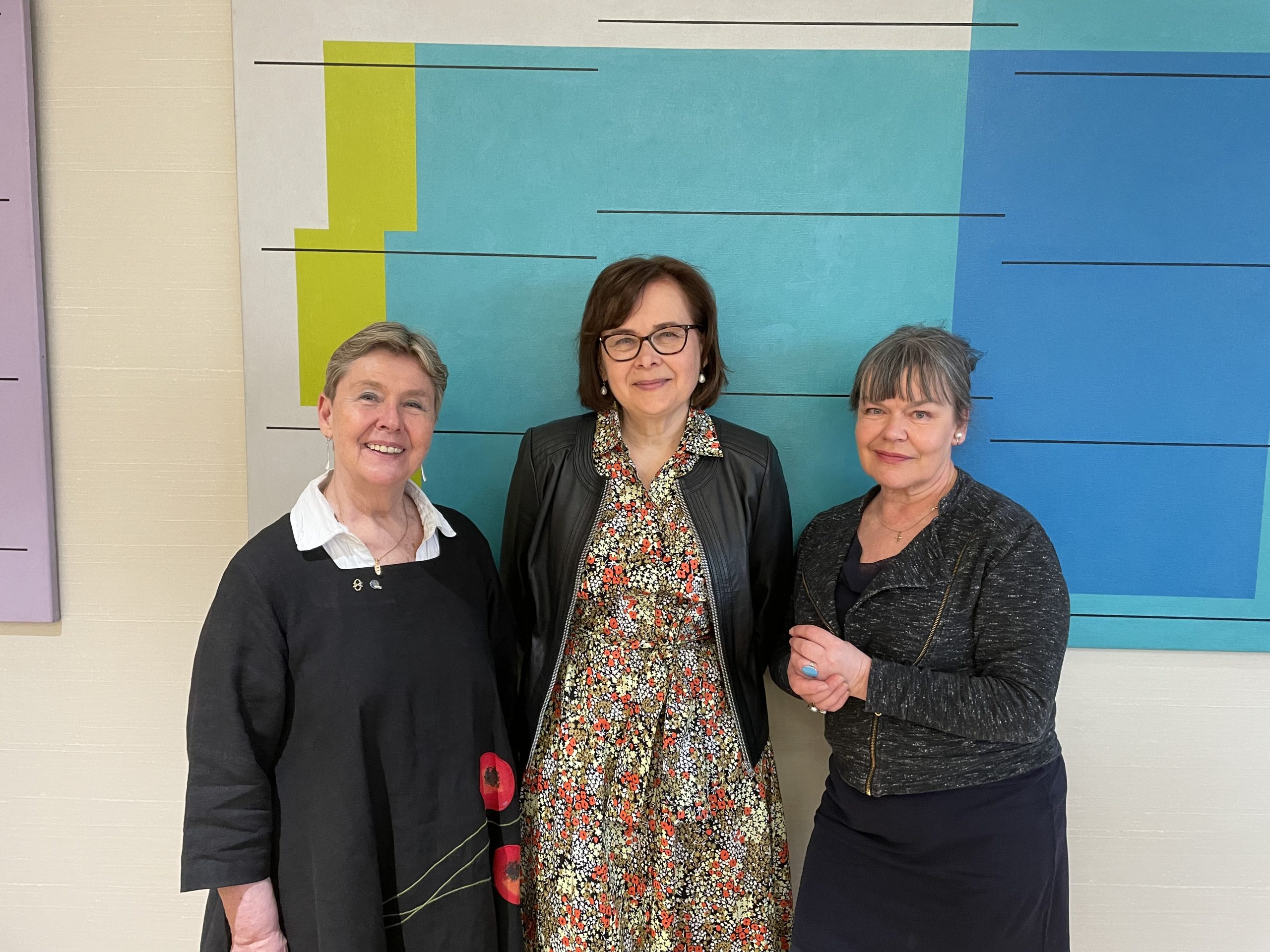 Uusi puheenjohtaja valittiin yksimielisesti Lääkäritalossa pidetyssä vuosikokouksessa 26.4.2022. Maarit Tyrkön jälkeen puheenjohtajana aloitti Kirsti Sintonen (keskellä). Varapuheenjohtajana jatkaa Marketta Mattila (oik.). Toiminnanjohtaja Kati Myllymäen kutsu vuosikokouksen pitämiseen Lääkäritalossa siirtyi talon remontin vuoksi muutamalla vuodella.